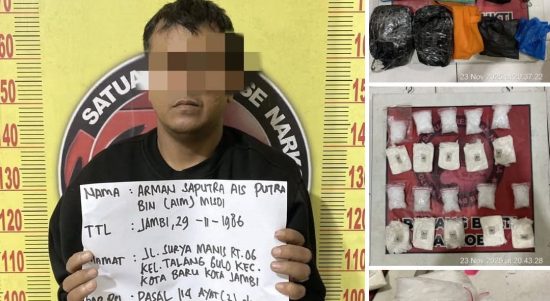 Tersangka AS, yang berhasil disergap petugas saat melintas di Jalan Patunas, Tungkal Ilir berikut barang bukti yang diamankan. foto: ist...